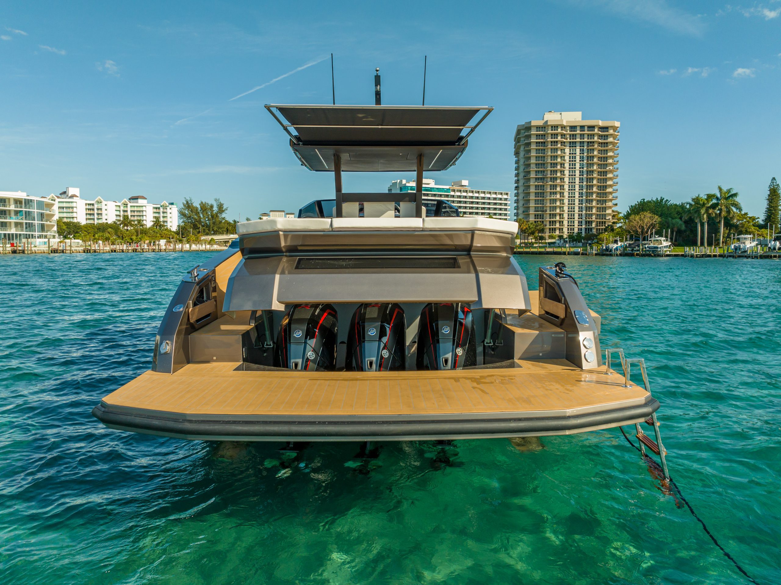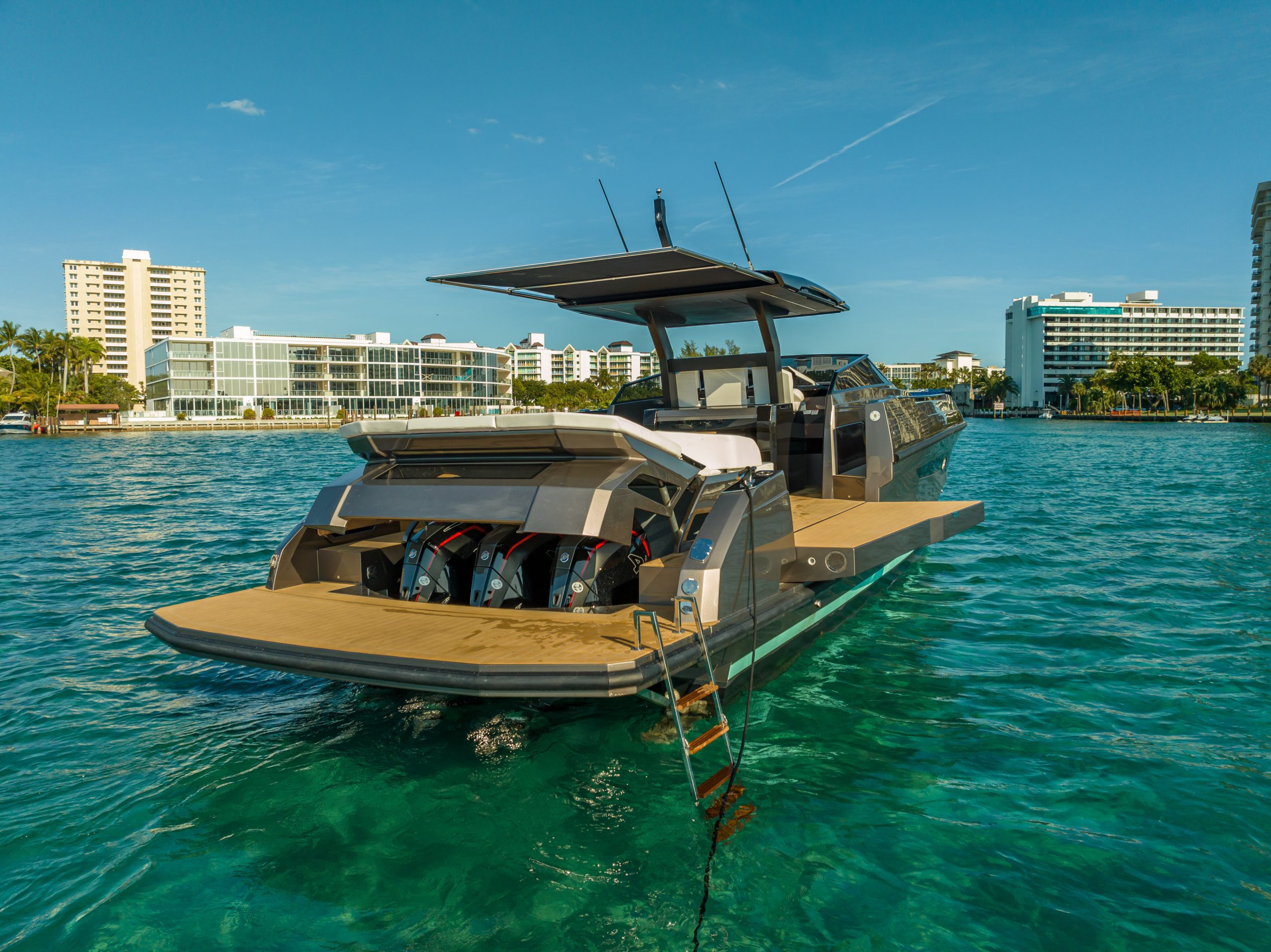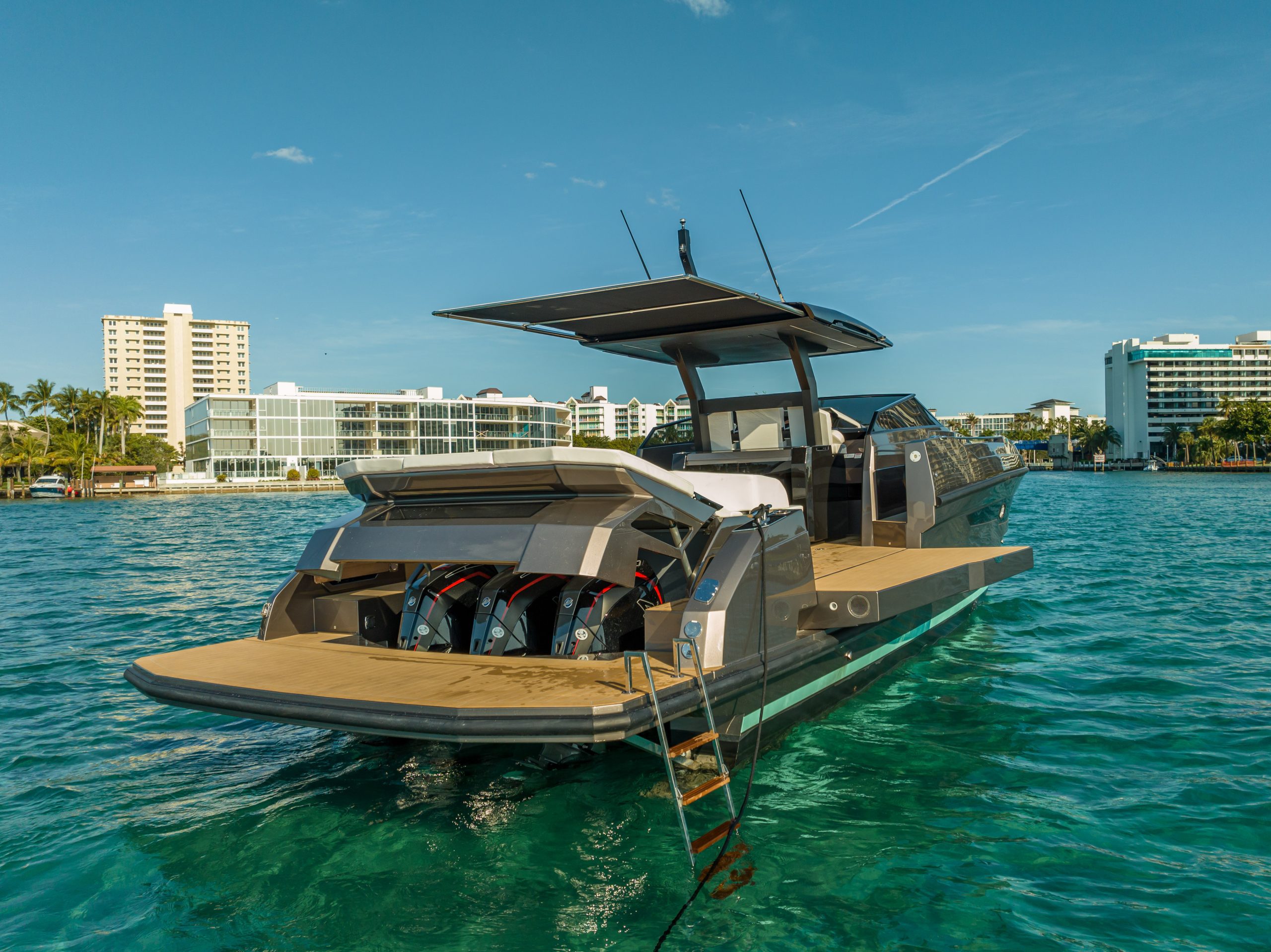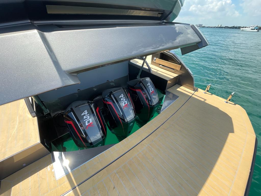 A 50ft yacht that offers a brilliant and fun performance, able to reach a maximum speed of over 40 knots, with the option of either 3 outboard or 2 inboard Diesel engines. The lines are clean and symmetrical. The wraparound wind shield offers perfect visibility. The sleek bow reflects the strong personality of the design. The spacious cockpit has a generous stern sun deck under which there is space for a tender. The bathing platform, spacious even on the version with the outboard engines, can be fitted with a tender lift and two amazing large terraces can be opened both on the right and on the left, adding substantial space to the already impressive cockpit and providing a unique connection with the water.