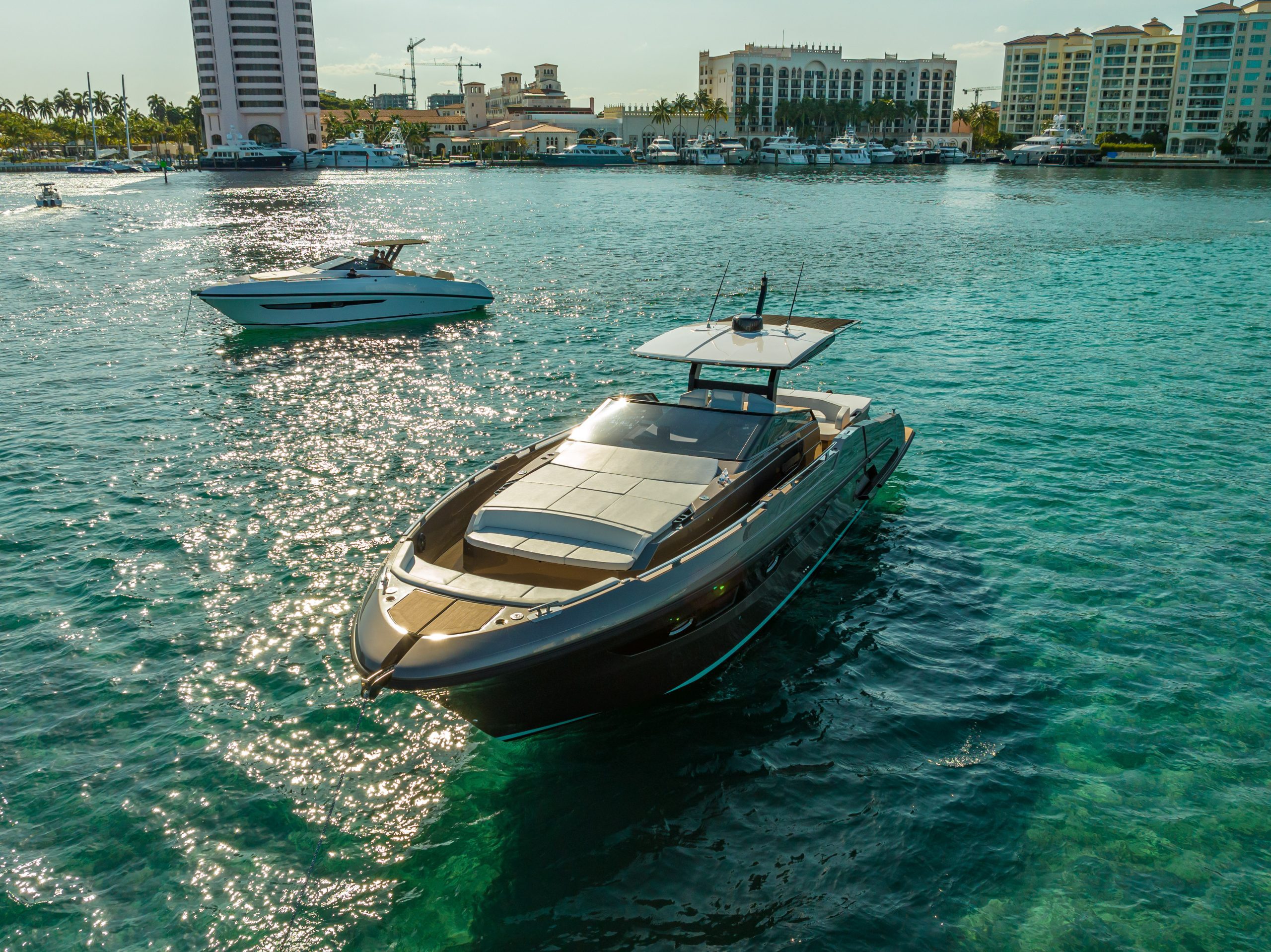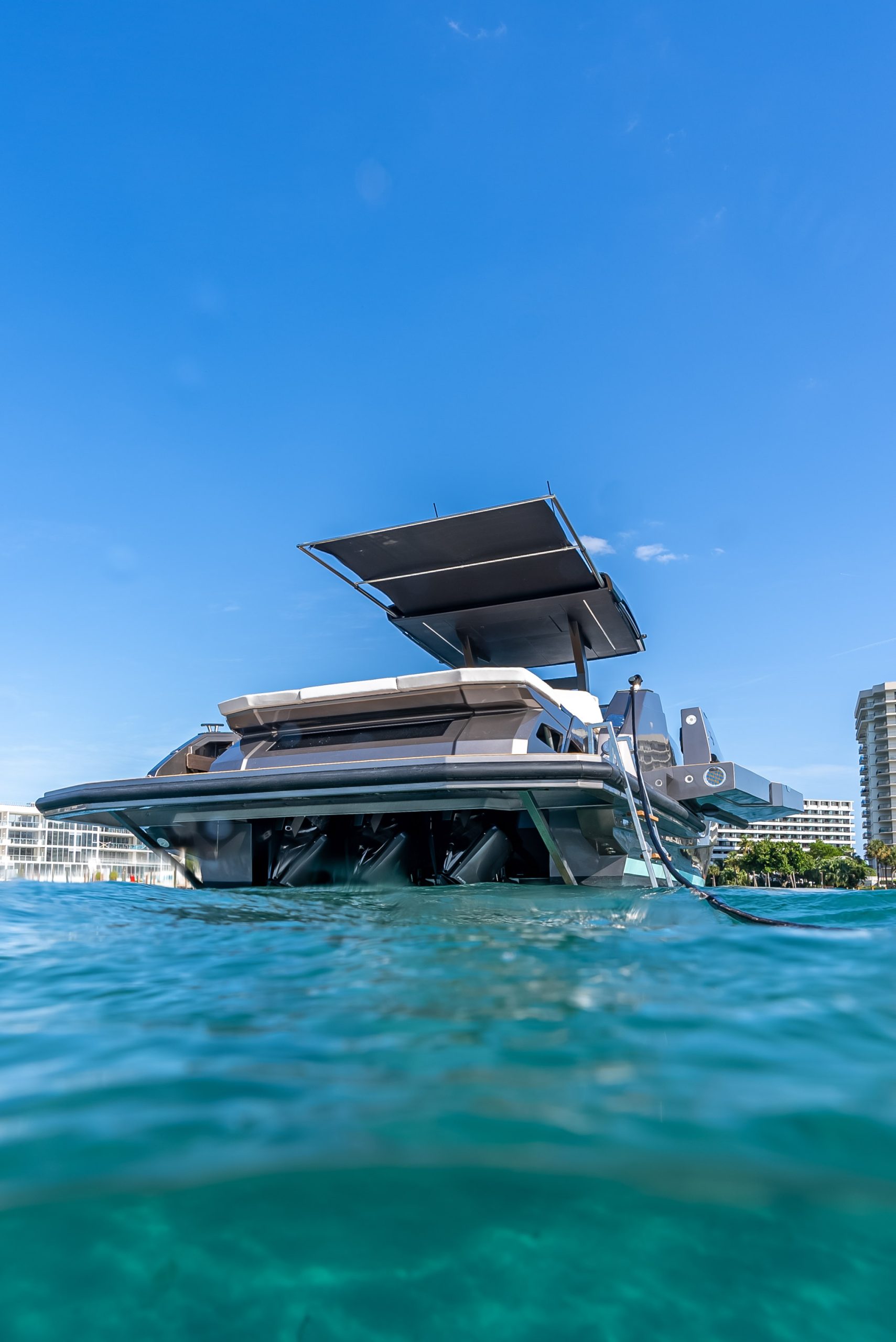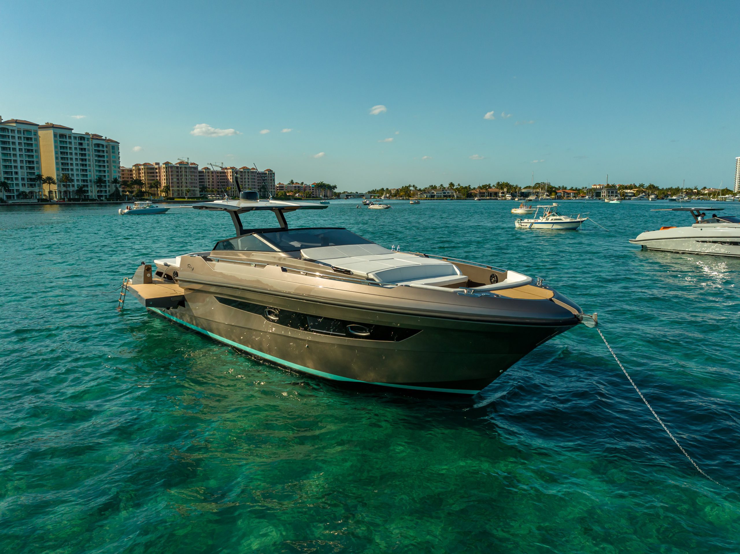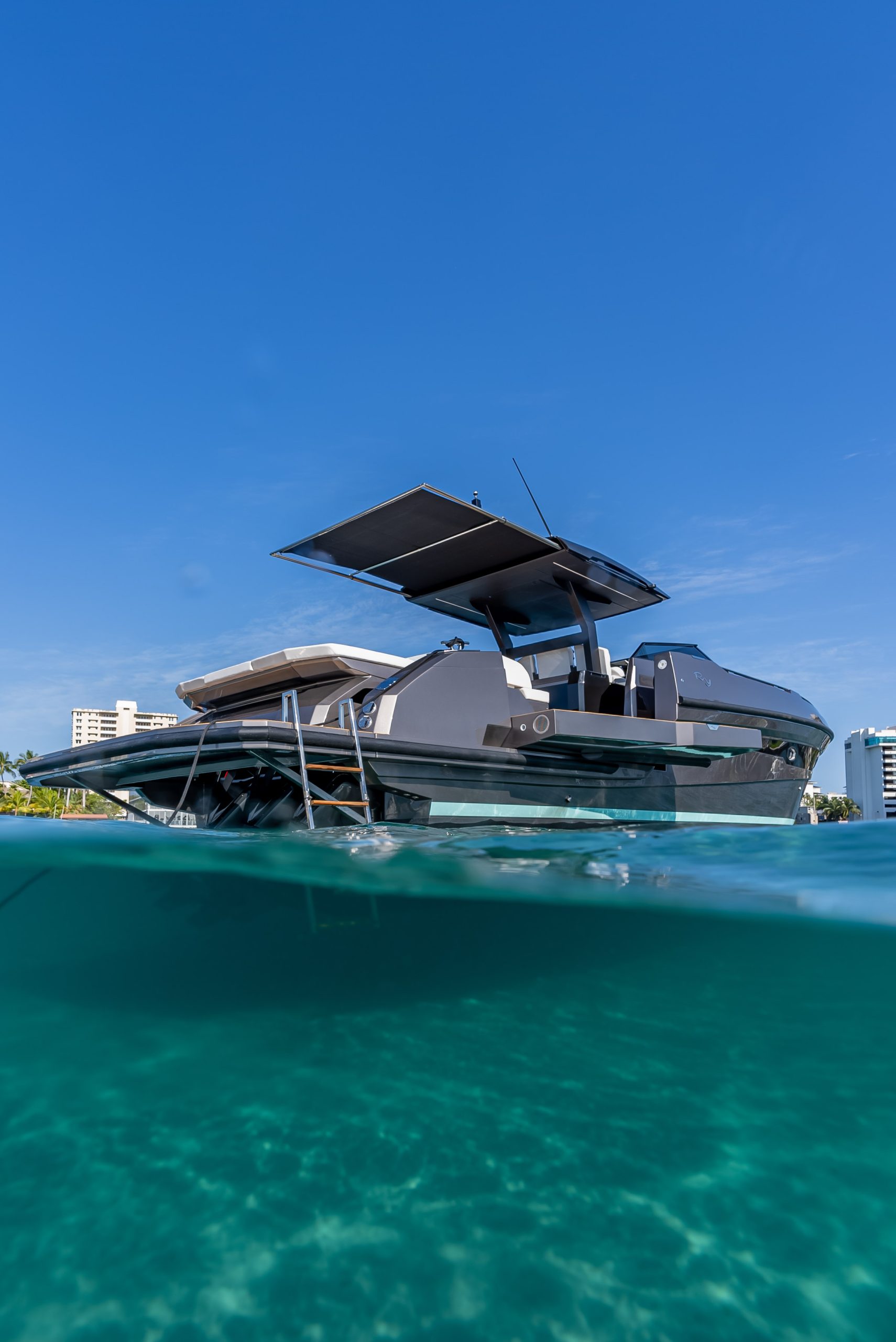 A 50ft yacht that offers a brilliant and fun performance, able to reach a maximum speed of over 40 knots, with the option of either 3 outboard or 2 inboard Diesel engines. The lines are clean and symmetrical. The wraparound wind shield offers perfect visibility. The sleek bow reflects the strong personality of the design. The spacious cockpit has a generous stern sun deck under which there is space for a tender. The bathing platform, spacious even on the version with the outboard engines, can be fitted with a tender lift and two amazing large terraces can be opened both on the right and on the left, adding substantial space to the already impressive cockpit and providing a unique connection with the water.