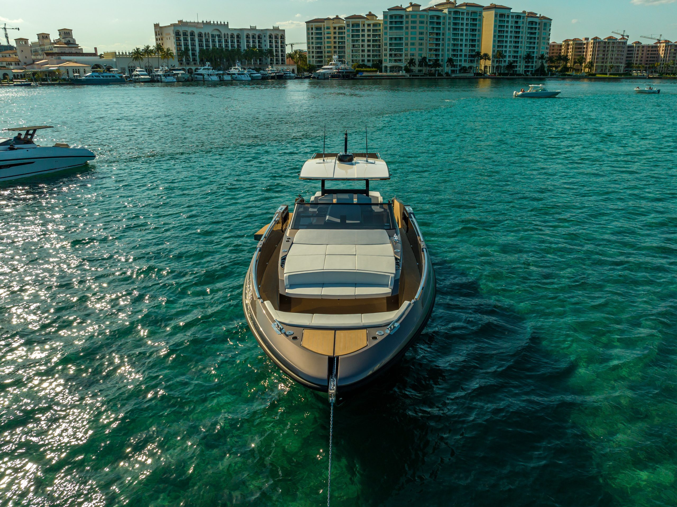 Its main characteristics include walk around deck and central console, maximum space on board thanks to a boundless cockpit, total safety, and ease of movement above deck: a boat designed to socialize, enjoy, and relax.