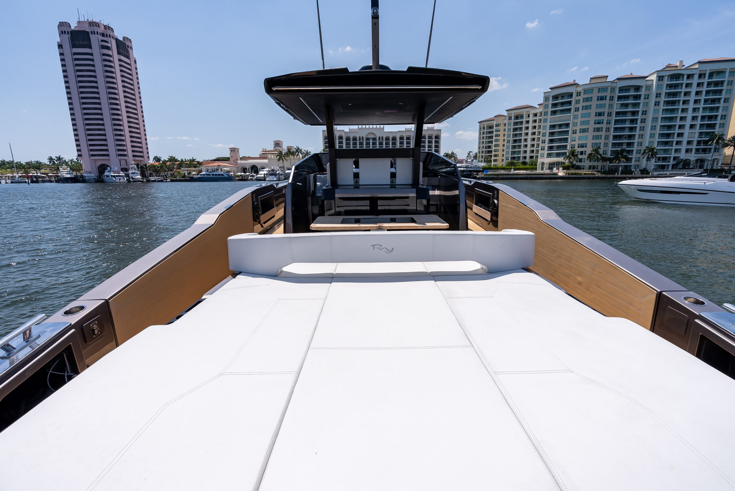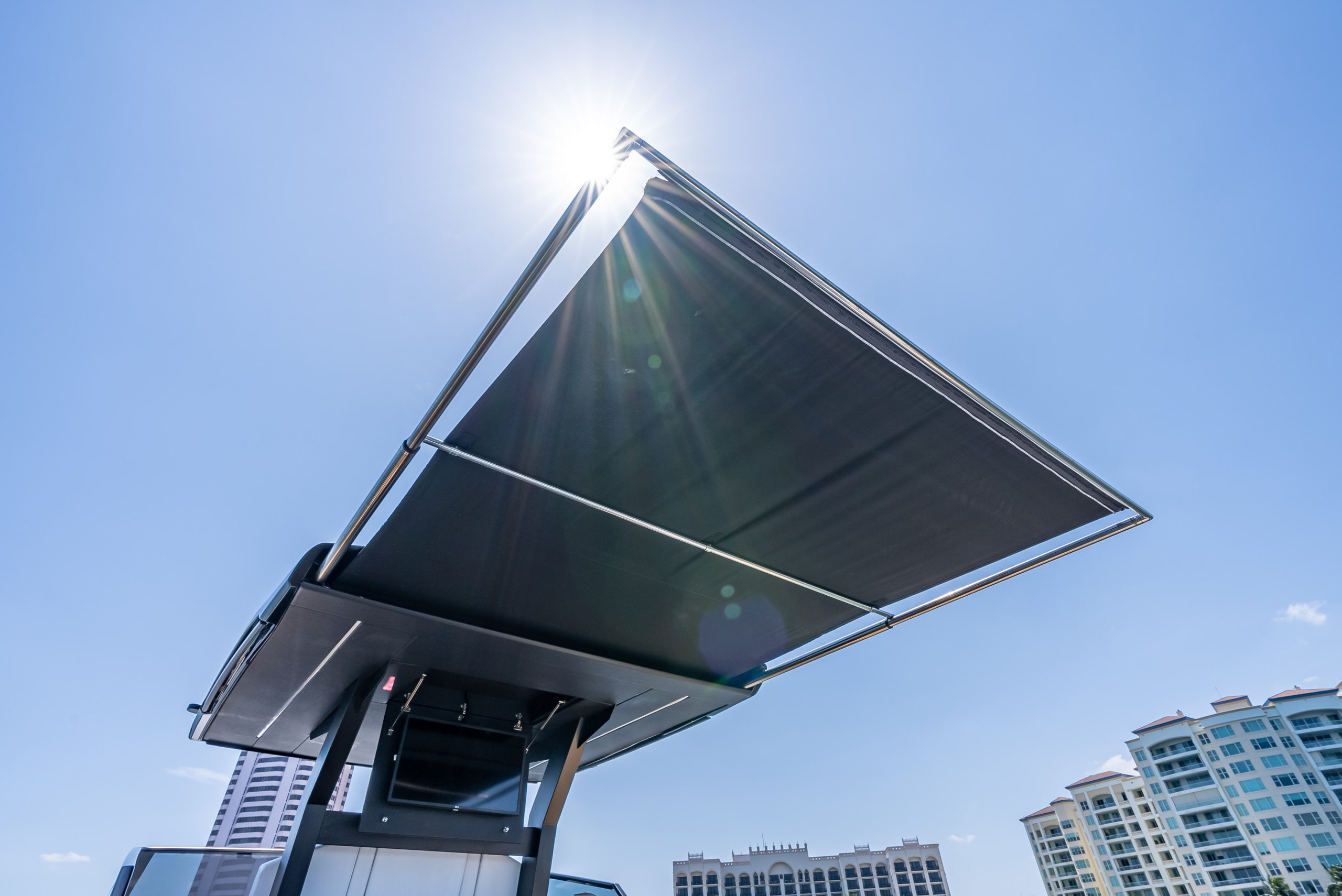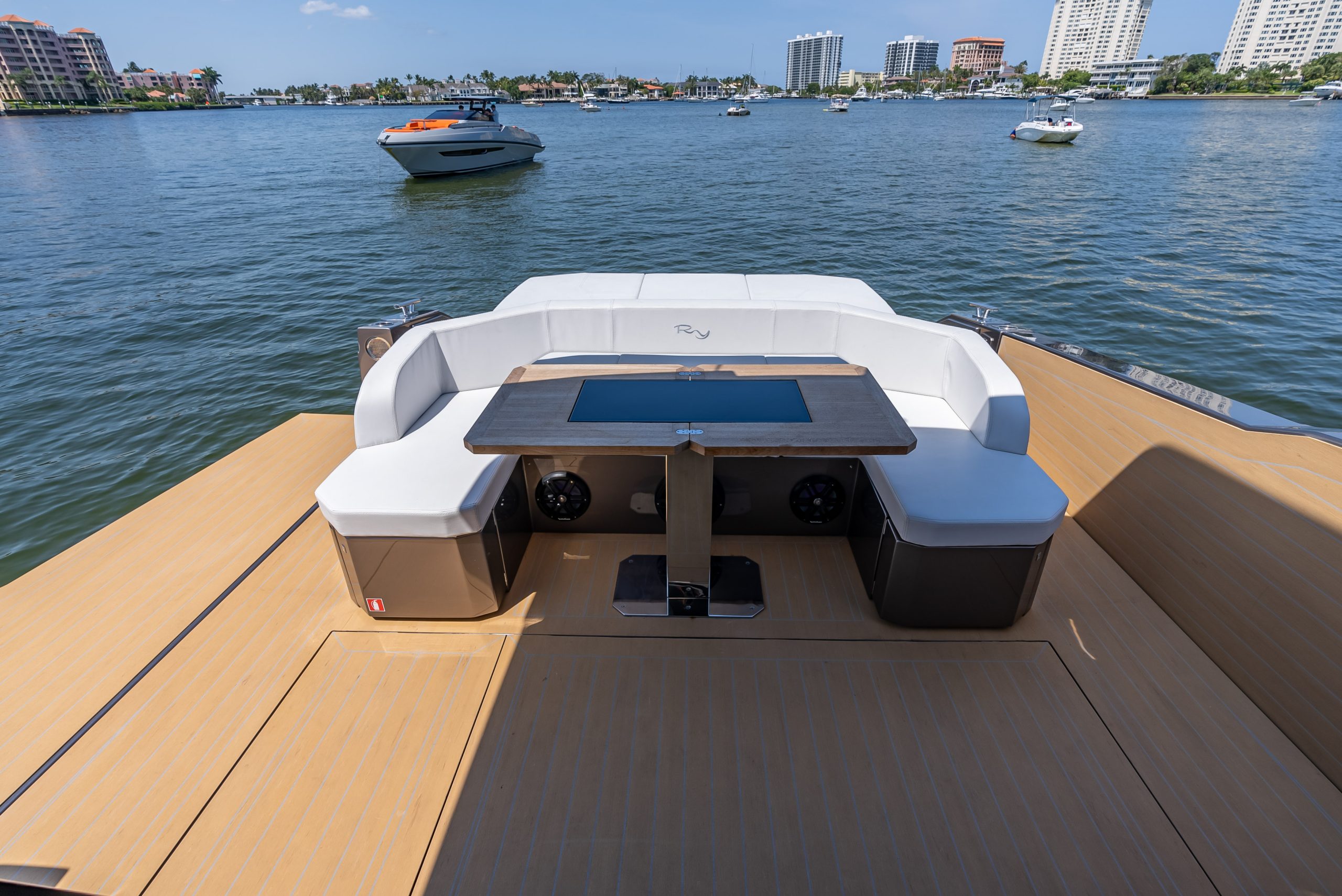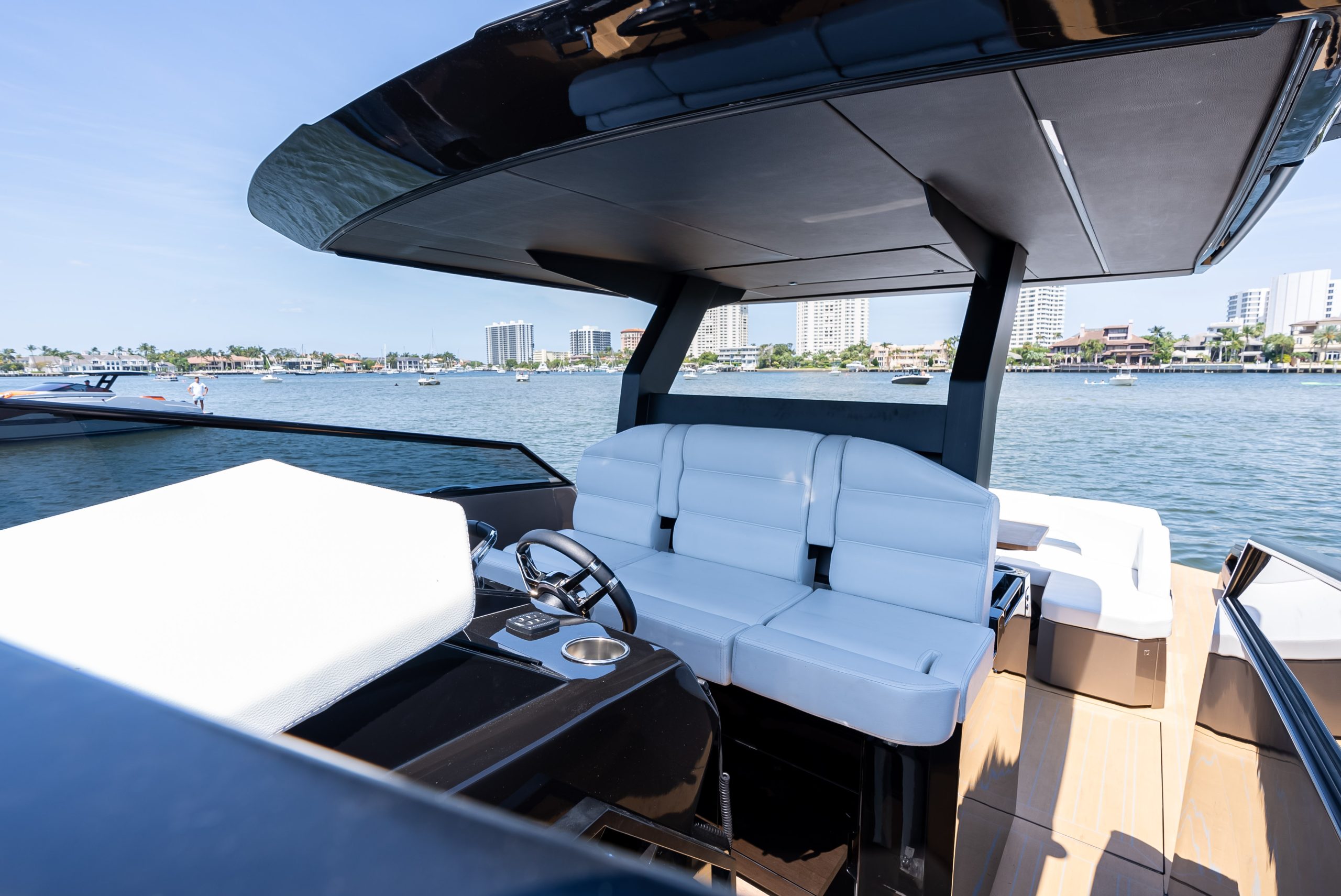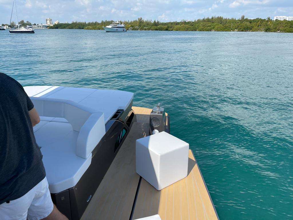 The table in the cockpit can easily accommodate six people and is completely concealable. Midship, a spacious open-air galley separates the cockpit from the highly technological, functional, and practical helm station, covered by a convenient, sporty, and light Bimini with just two supports (instead of the usual four featured by the competition), yet extremely stable, which offers generous coverage. The addition of an electric cover from the Bimini and two shades at the bow and the stern offer plenty of options to manage sun and shade as required. The walkway to the bow is wide, practical, and safe.