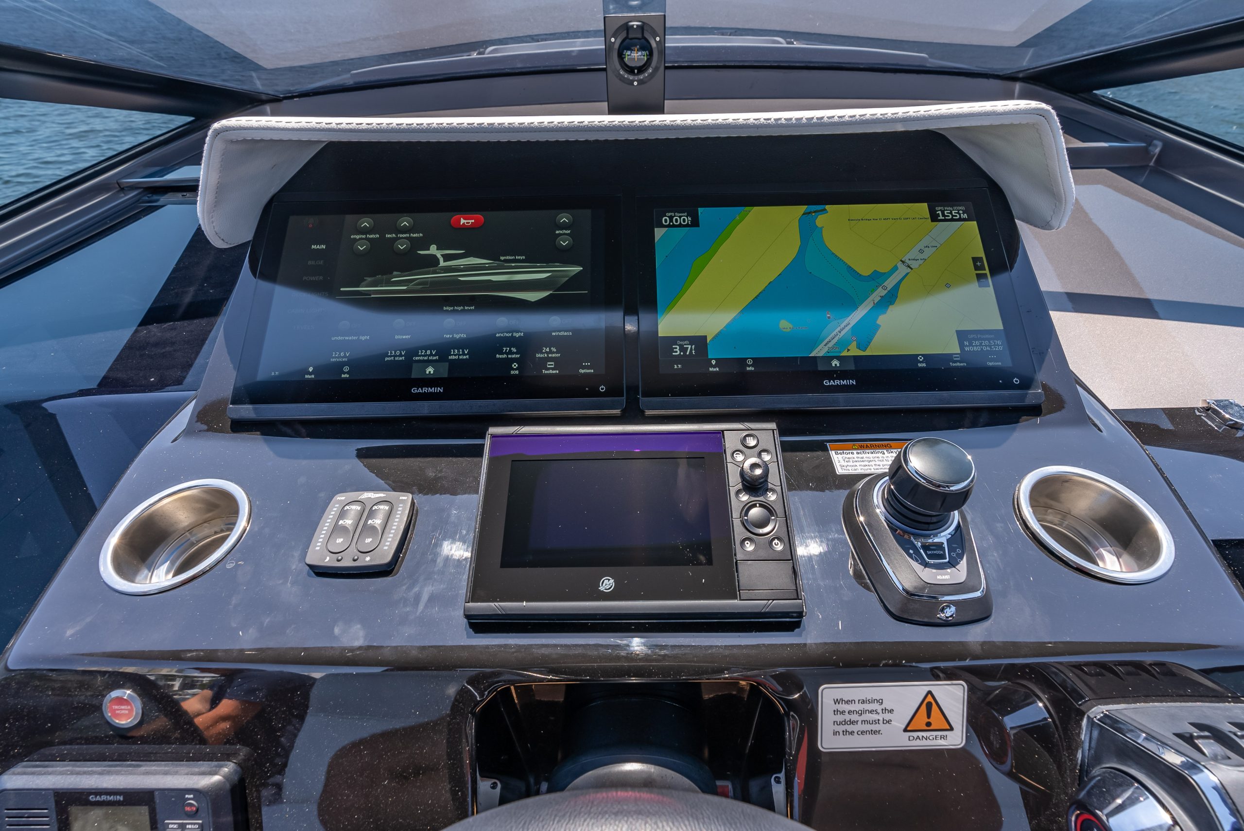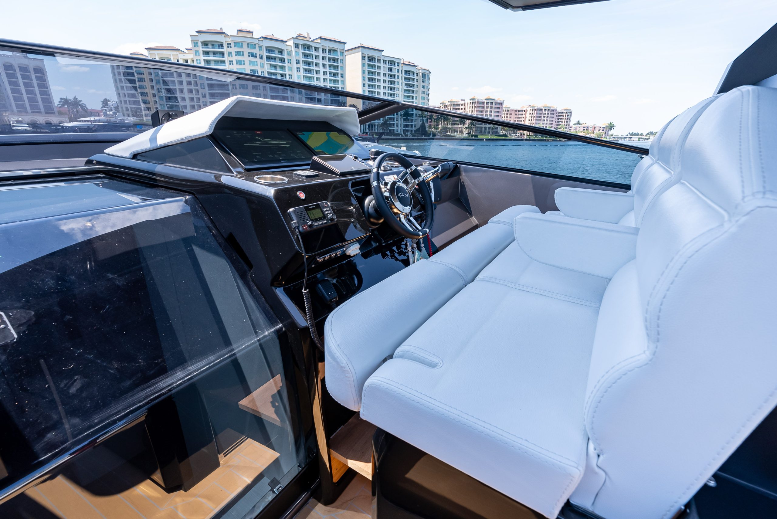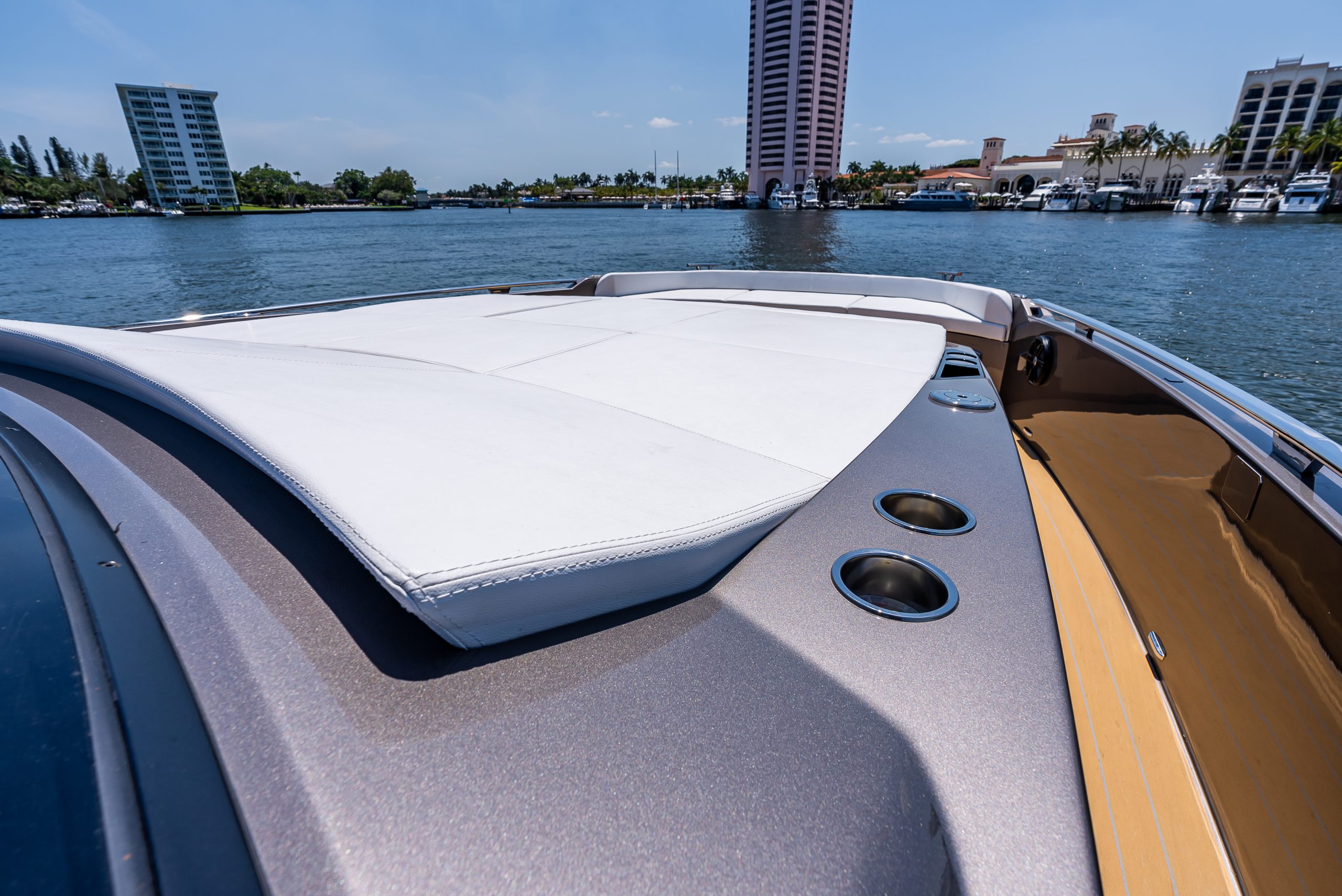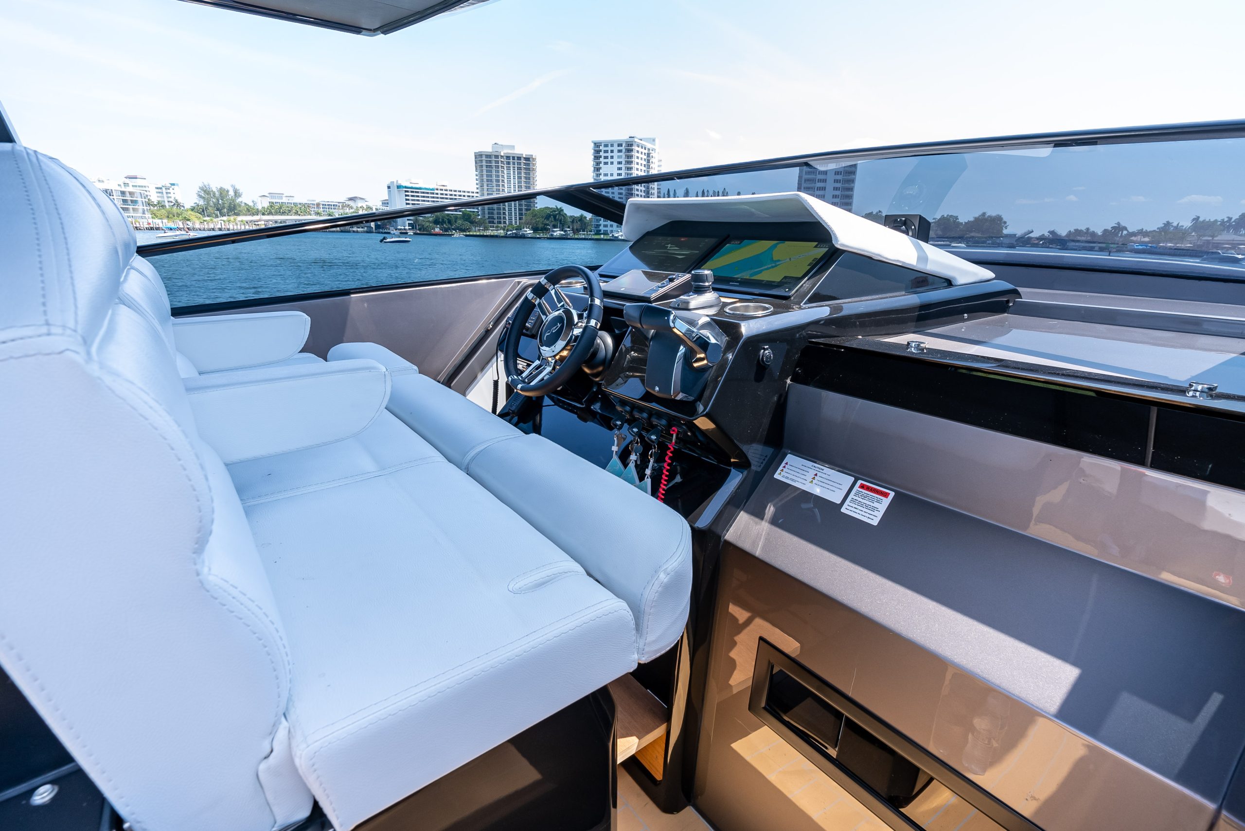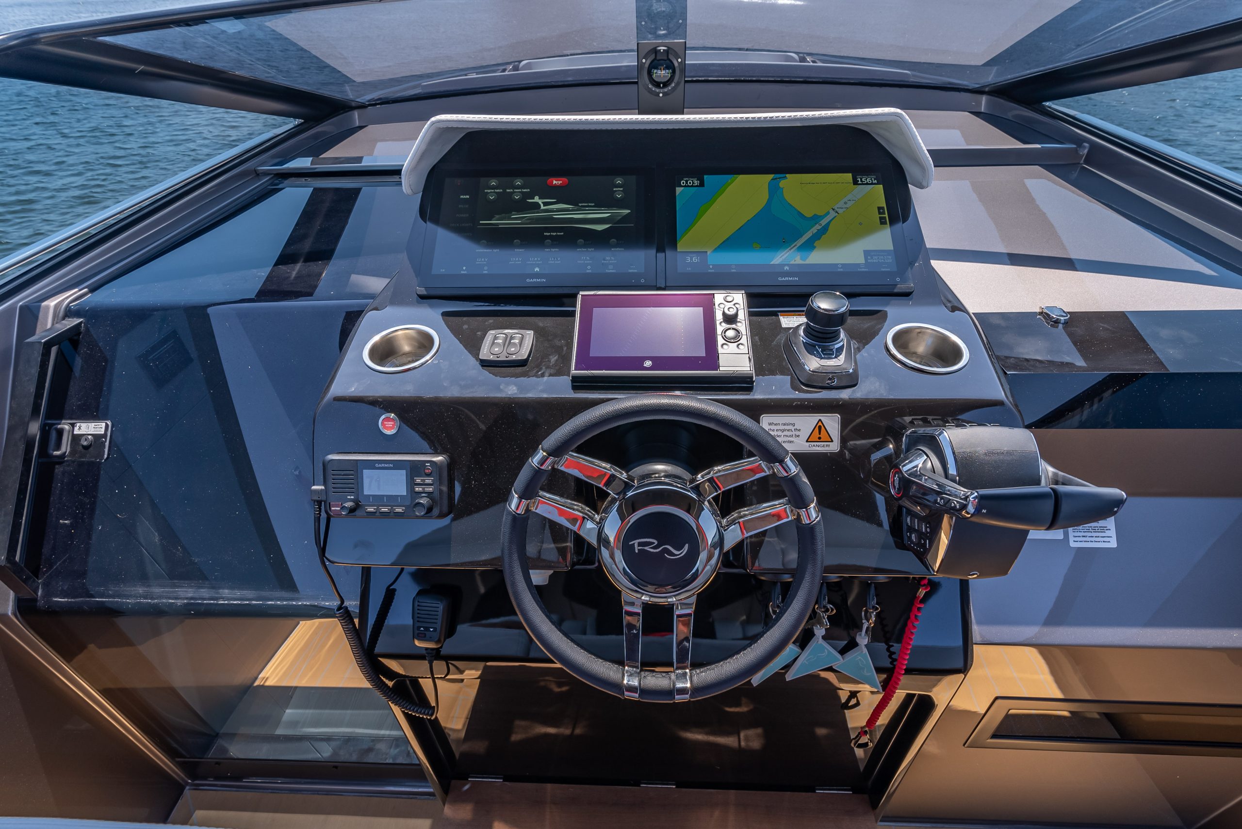 The table in the cockpit can easily accommodate six people and is completely concealable. Midship, a spacious open-air galley separates the cockpit from the highly technological, functional, and practical helm station, covered by a convenient, sporty, and light Bimini with just two supports (instead of the usual four featured by the competition), yet extremely stable, which offers generous coverage. The addition of an electric cover from the Bimini and two shades at the bow and the stern offer plenty of options to manage sun and shade as required. The walkway to the bow is wide, practical, and safe.