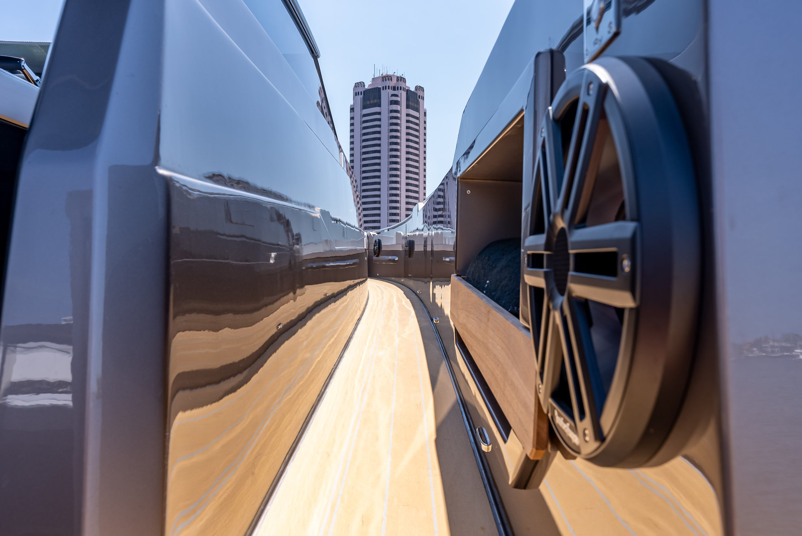 A two-seat sofa is just a few strides away, opposite the sun lounger on the deckhouse. The interior is open space, bright and finished with great attention to details. If needed, when guests are on board, the cabins can be divided thanks to a mobile partition, creating privacy and exclusive comfort.