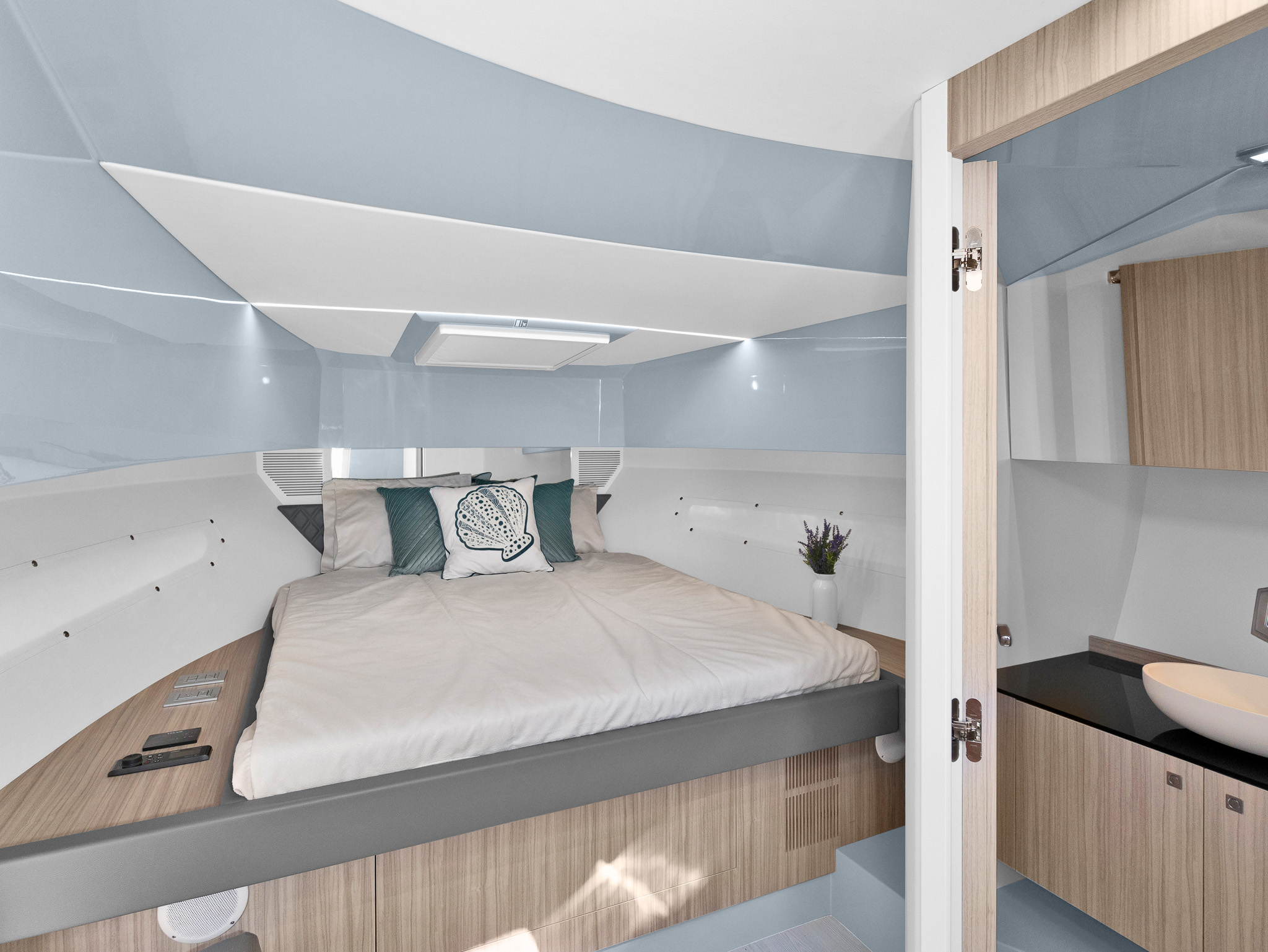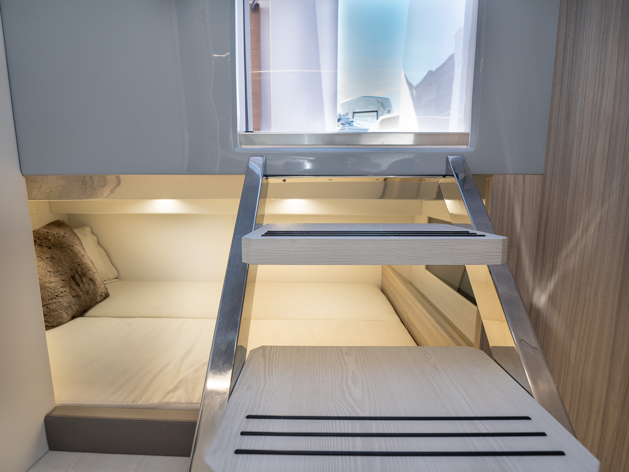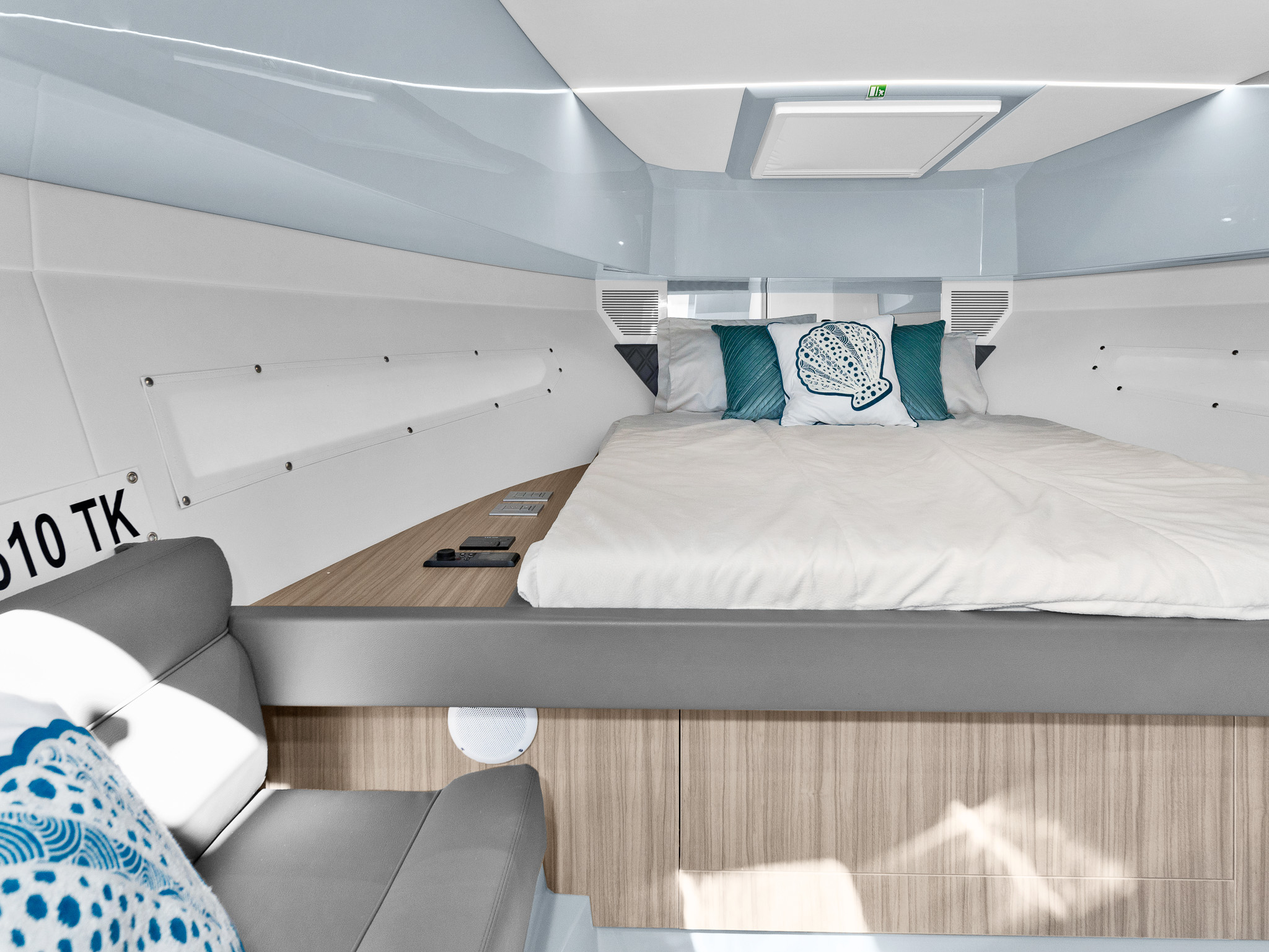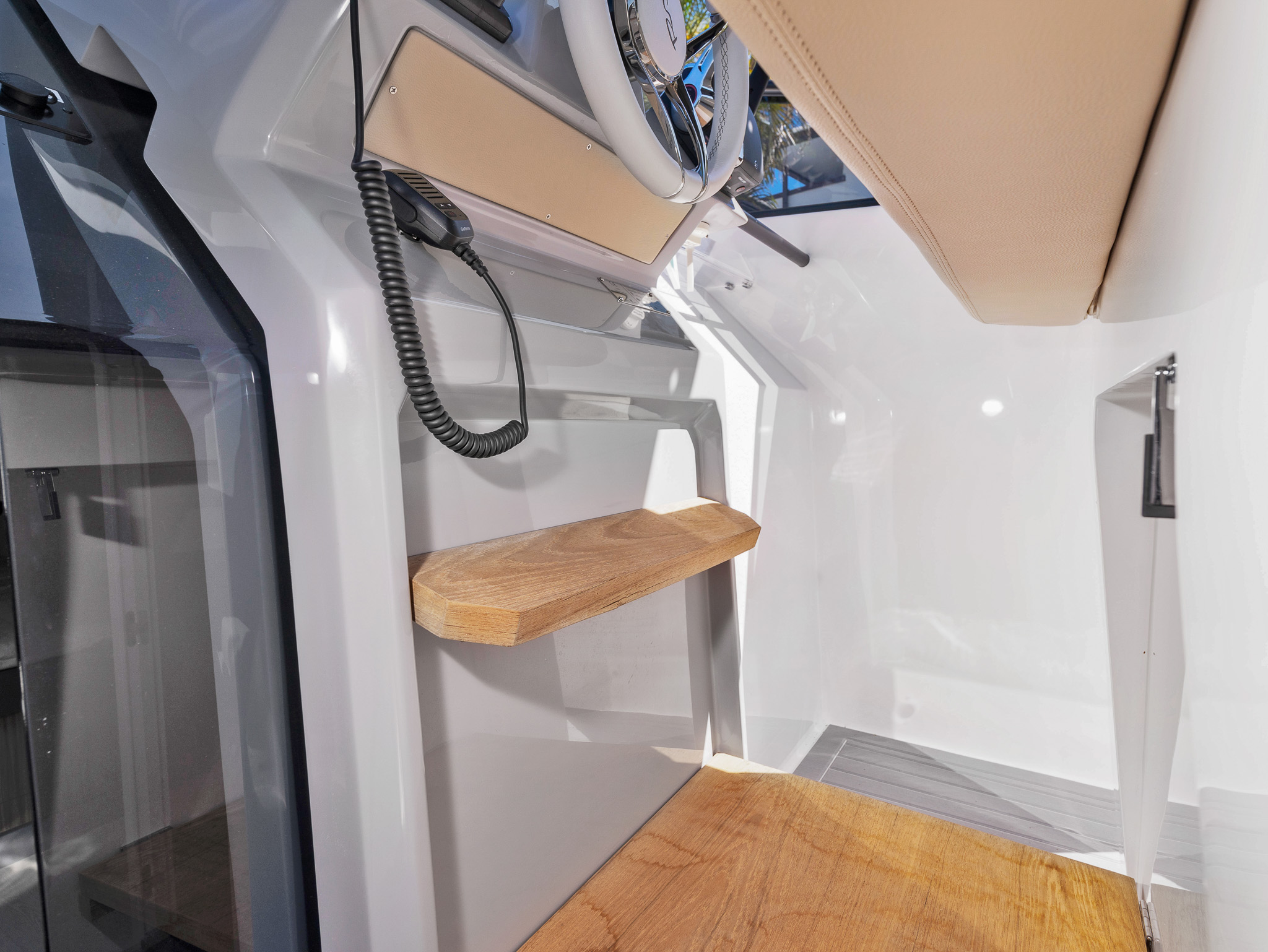 CHARMING AND FUNCTIONAL. The cockpit as well as the aft and stern sundeck are extremely spacious. Sheltered by a sporty T-Top, the cockpit has been fitted with a concealable table aft and one-piece fiberglass structure further amidships, which separate this area from helm station and can be equipped with a small galley. The lower deck features a bathroom with shower and accommodations for four, all flooded with abundant natural light courtesy of marvelous glass surface that add a sophisticated touch to the hull’s lines: providing everything one might need for a 5-stars weekend experience.