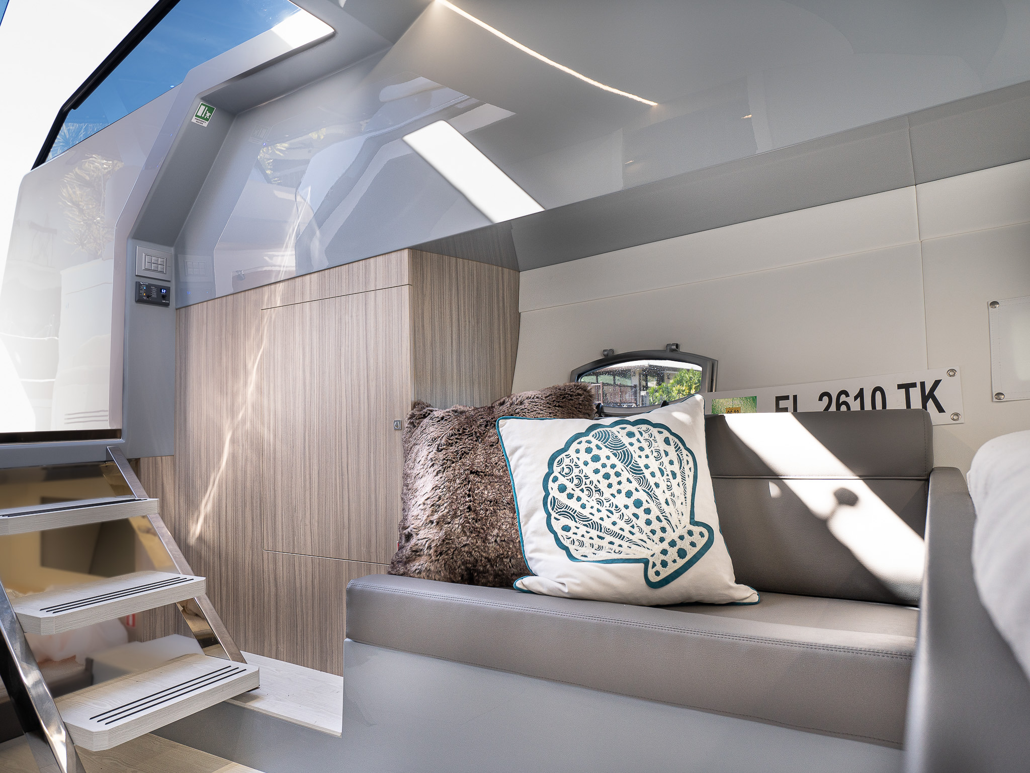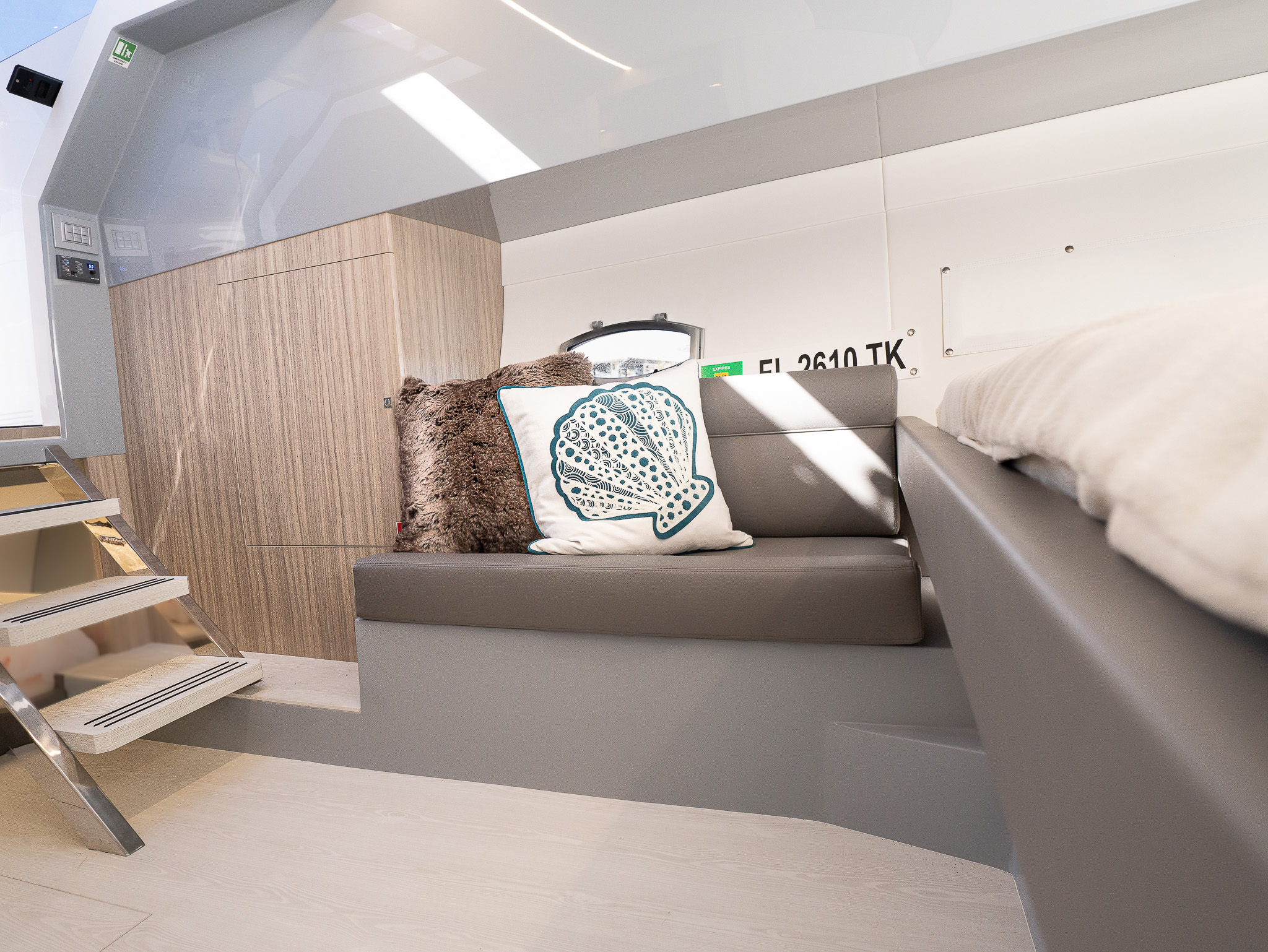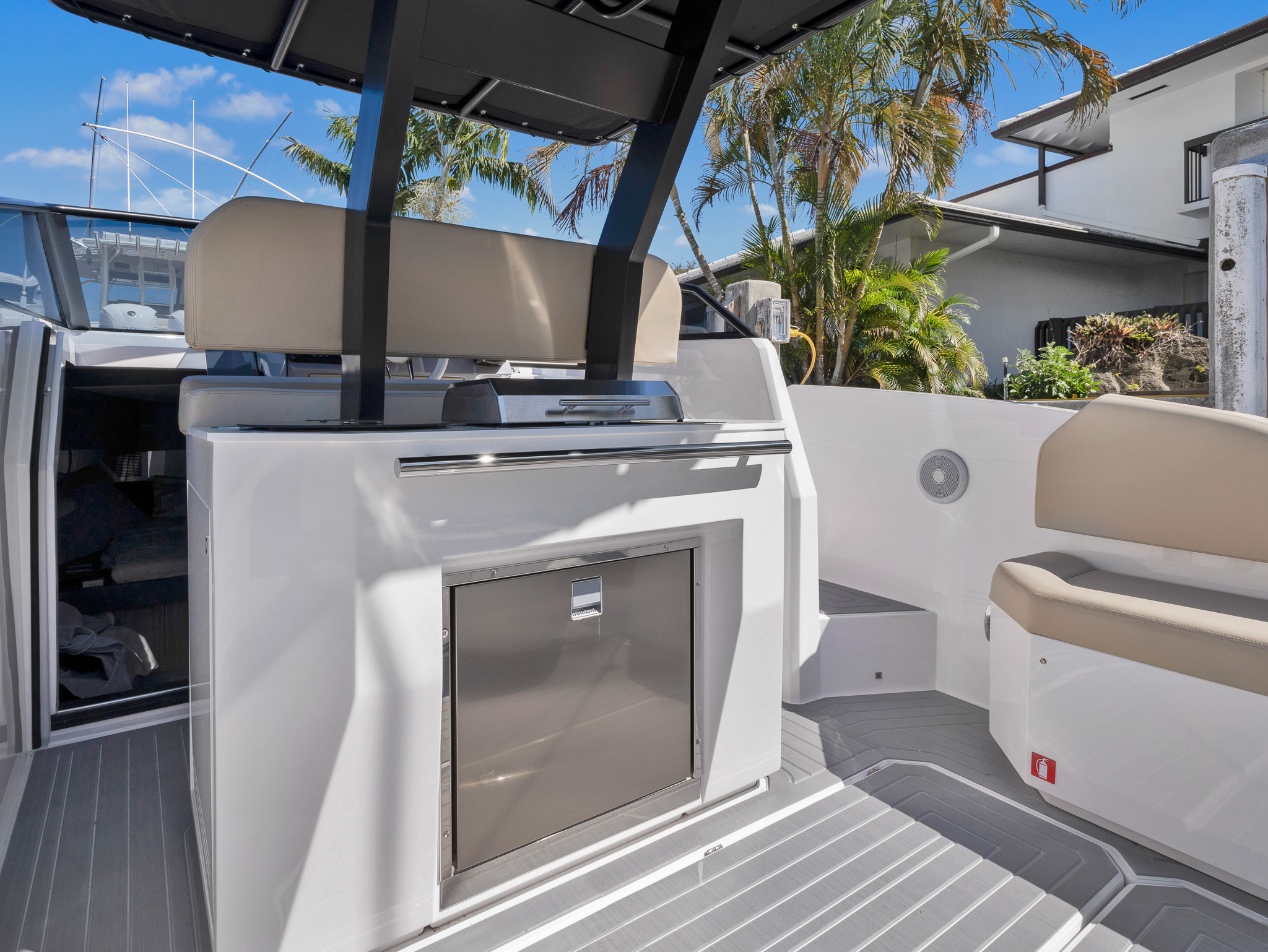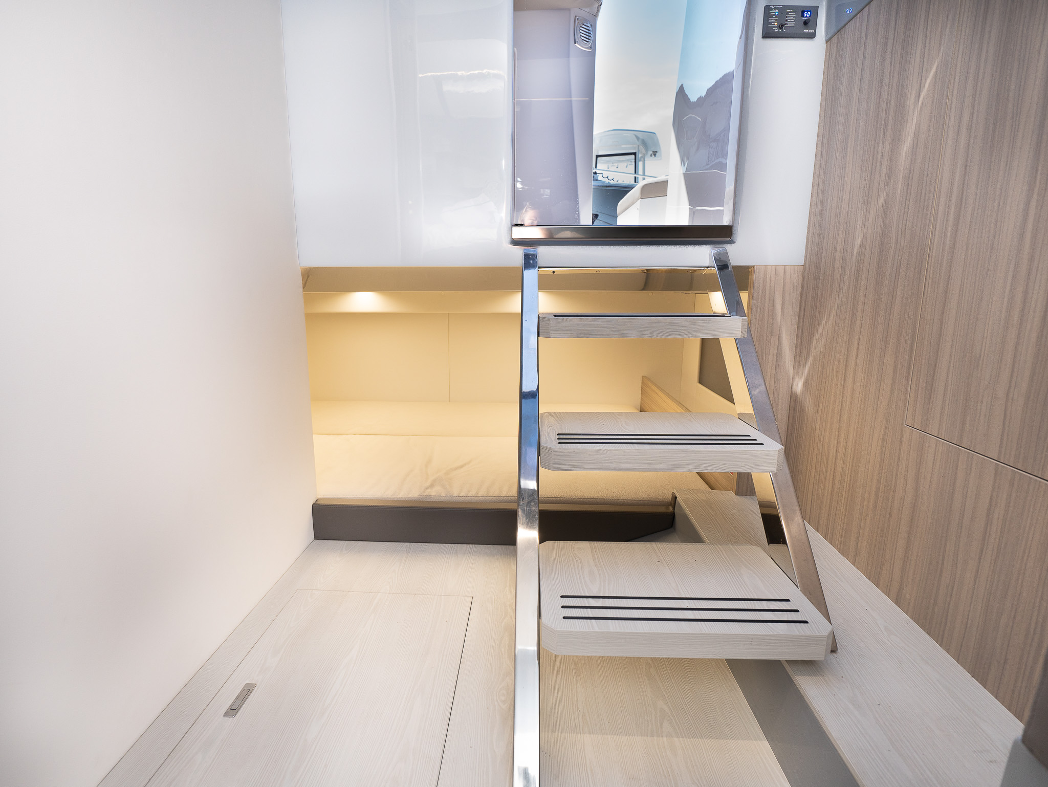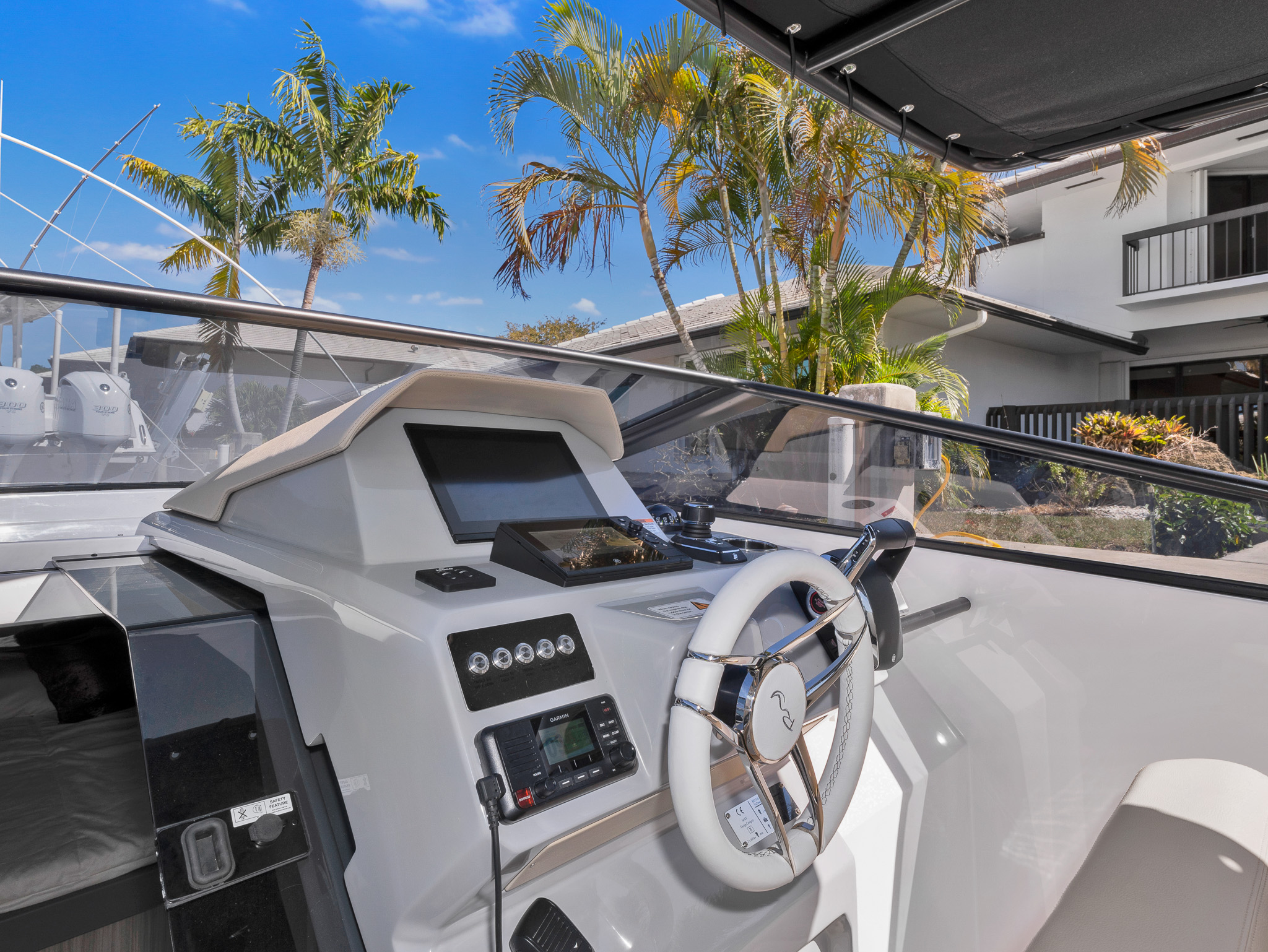CHARMING AND FUNCTIONAL. The cockpit as well as the aft and stern sundeck are extremely spacious. Sheltered by a sporty T-Top, the cockpit has been fitted with a concealable table aft and one-piece fiberglass structure further amidships, which separate this area from helm station and can be equipped with a small galley. The lower deck features a bathroom with shower and accommodations for four, all flooded with abundant natural light courtesy of marvelous glass surface that add a sophisticated touch to the hull’s lines: providing everything one might need for a 5-stars weekend experience.